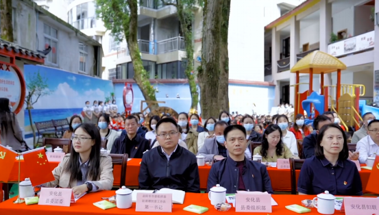 5月17日上午,安化首个“红色儿童故事广场”在蓝天幼儿园举行了揭牌仪式。益阳市市委组织部驻清塘扶贫工作队第一书记赵远帆,县委组织部副部长、县委两新工委书记李远胜,县妇联主席夏昳,团县委书记汤婧婷,县委教育工委副书记、县教育局副局长邹友良出席揭牌仪式,全县23个乡镇幼教点优秀教师代表,蓝天幼儿园家委会成员,蓝天幼儿园全体教师、幼儿参加了仪式。仪式由安化二中校长刘仁先主持。