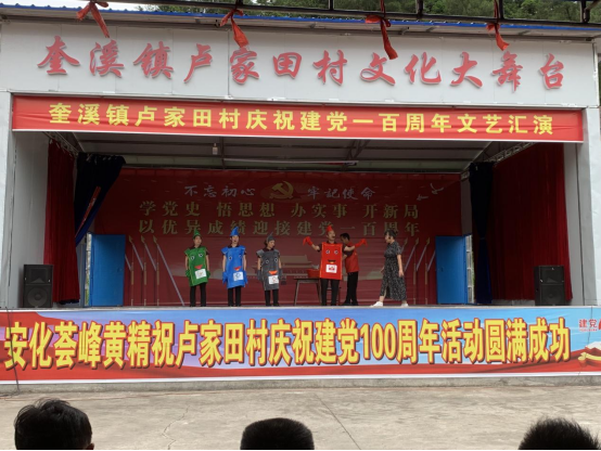 6月18日,奎溪镇卢家田村举办庆祝建党一百周年文艺汇演活动,邀请奎溪镇党政领导、各办中心负责人、各党组织负责人、市县派出乡村振兴工作队队长观看演出。 奎溪镇党委委员、组织委员指出,今年是“十四五”规划开局之年,也是巩固拓展脱贫攻坚续接乡村振兴的奋斗之年,在中国共产党一百岁华诞即将到来之际,卢家田村组织盛会用文艺汇演的方式来颂扬伟大的党、颂扬日益繁荣昌盛的祖国。下一步,全镇上下将同心同力同向行、共战共进共担当,投身到加快建设家乡发展的伟大实践中,努力开创奎溪乡村振兴的新篇章。 ![]() 活动节目内容形式丰富、内容新颖,包括唱歌、小品、歌舞、阳戏等节目12个,还在其中穿插了党史知识抢答环节。演出在集体舞《没有共产党就没有新中国》中隆重拉开帷幕,一个个节目深情回顾了老一辈共产党人的峥嵘岁月,表达了在习近平新时代中国特色社会主义思想的指引下,坚定信心,永远跟党走,结尾全体演员和观众合唱一曲《没有共产党就没有新中国》,最终升华主题,表达了对党、对祖国热忱的爱。
